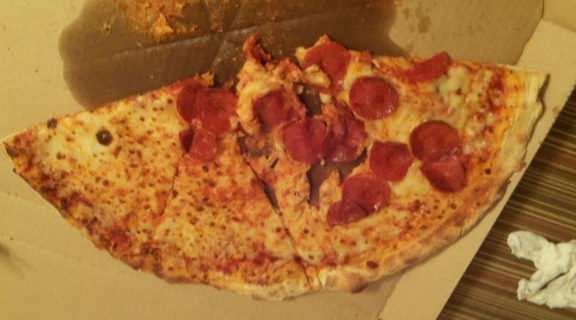 Friday Domino's gets it wrong--again. After much angst I decided to order a pizza from my local NJ Domino's outlet last night. I ordered the pie about five minutes to closing, asking if it was too late to order a pie for delivery. The order-taker gave no indication whatsoever that the late hour was a problem. Indeed, she, an assistant manager there, was friendly and accommodating enough; the problem is, no matter how friendly and accommodating, this Domino's location can't seem to get the product right. They are in perpetual pie replacement (PPM) mode for me. Upon attempting to pull a slice or two from the pie, the slices broke in the middle! Another slices from this pie would also break as the pie was consumed, making a total of three slices. The problem appeared to be that the center of the pie had stuck to the box. Why, I don't know. Professional pizzamaking is not my area of expertise- -but it's supposed to be theirs. I actually ended up eating some of this pie with a fork! Also, after eating about six slices, the salt in the pie starting getting to me; the pie was too salty. And this was without the garlic sprinkled on the crust, which I had them withhold. Here are actual photographs of this pie, taken with my Kodak PlayTouch camcorder:
